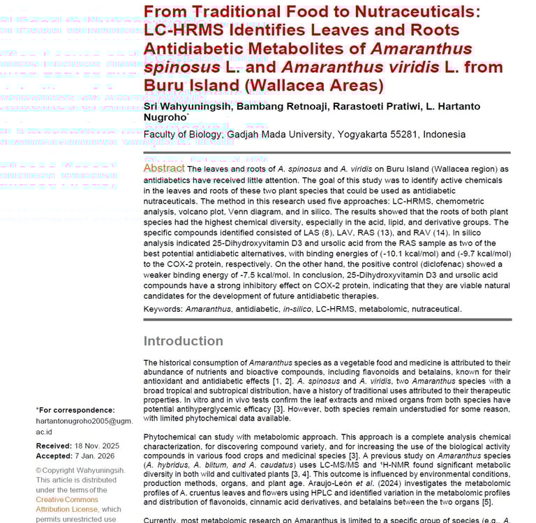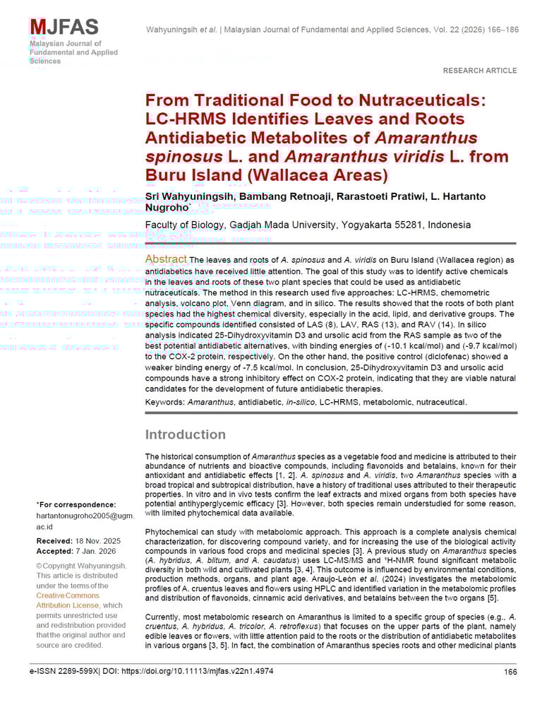 From Traditional Food to Nutraceuticals: LC-HRMS Identifies Leaves and Roots Antidiabetic Metabolites of AmaranthusspinosusL. and AmaranthusviridisL. from Buru Island (Wallacea Areas). Malaysian Journal of Fundamental and Applied Sciences, Vol. 22 (2026) 166−186