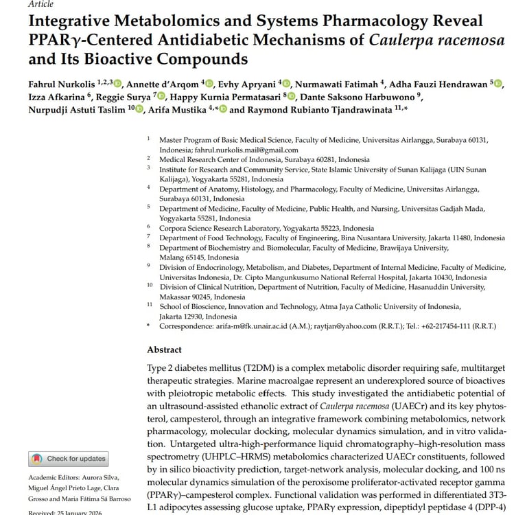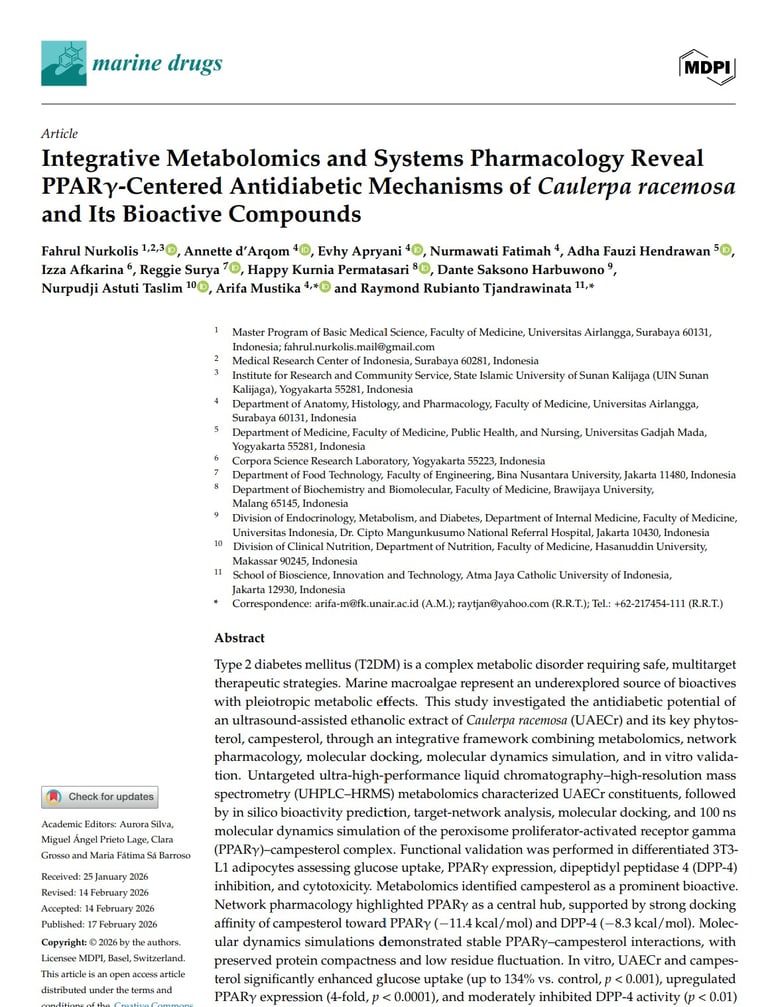 Integrative Metabolomics and Systems Pharmacology Reveal PPARγ-Centered Antidiabetic Mechanisms of Caulerpa racemosa and Its Bioactive Compounds. MDPI. Mar. Drugs 2026, 24(2), 82; https://doi.org/10.3390/md24020082