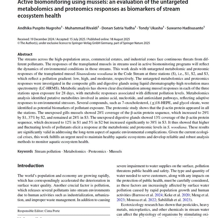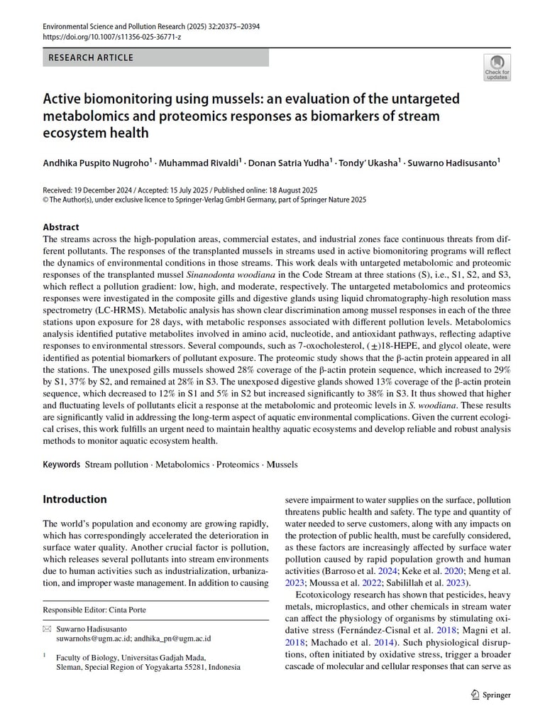 Active biomonitoring using mussels: an evaluation of the untargeted metabolomics and proteomics responses as biomarkers of stream ecosystem health. Springer Nature. Environmental Science and Pollution Research