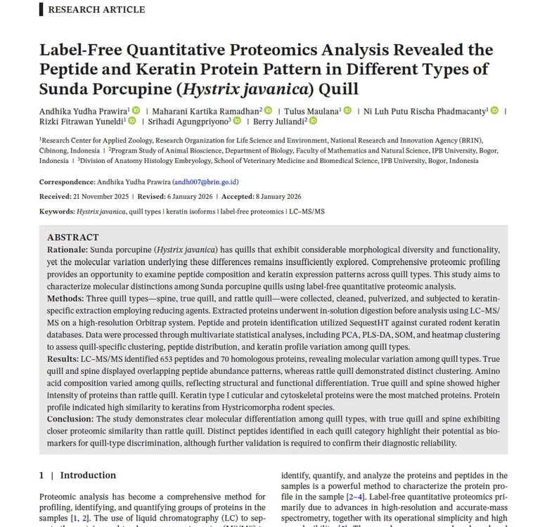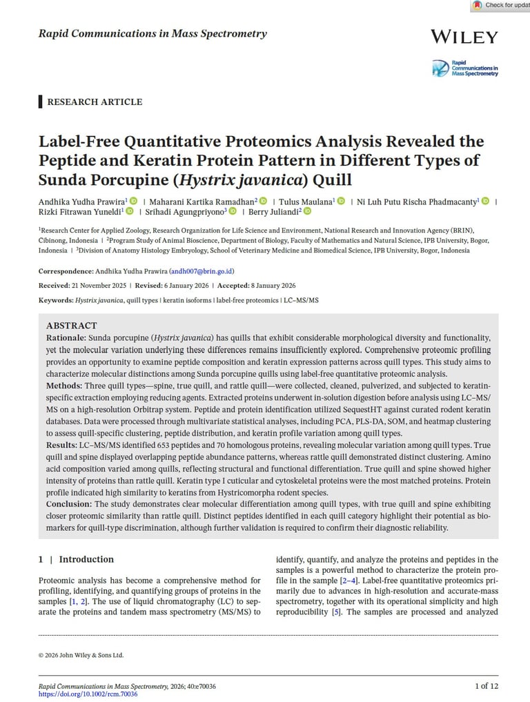 Label-Free Quantitative Proteomics Analysis Revealed the Peptide and Keratin Protein Pattern in Different Types of Sunda Porcupine (Hystrix javanica) Quill. Rapid Communications in Mass Spectrometry. Wiley.