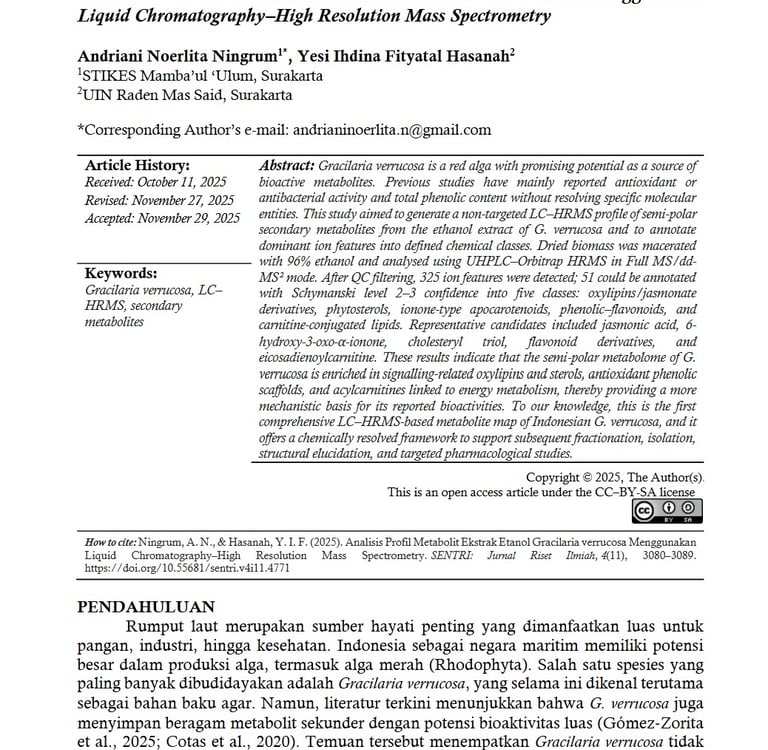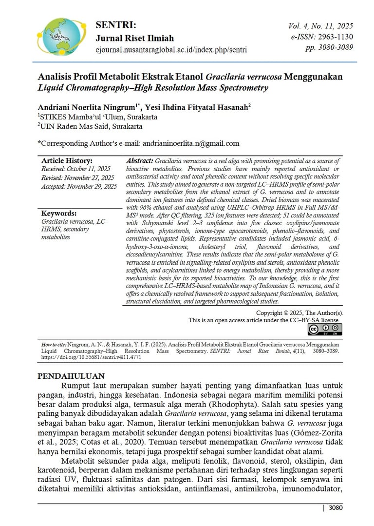 Analisis Profil Metabolit Ekstrak Etanol Gracilaria verrucosa Menggunakan Liquid Chromatography–High Resolution Mass Spectrometry. SENTRI: Jurnal Riset Ilmiah, 4(11), 3080–3089. https://doi.org/10.55681/sentri.v4i11.4771