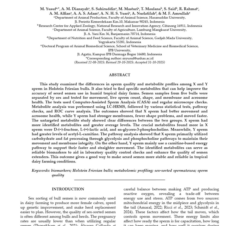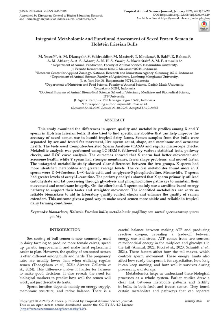 Integrated Metabolomic and Functional Assessment of Sexed Frozen Semen in Holstein Friesian Bulls. Tropical Animal Science Journal, January 2026, 49(1):19-29