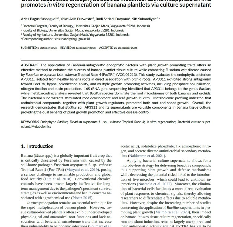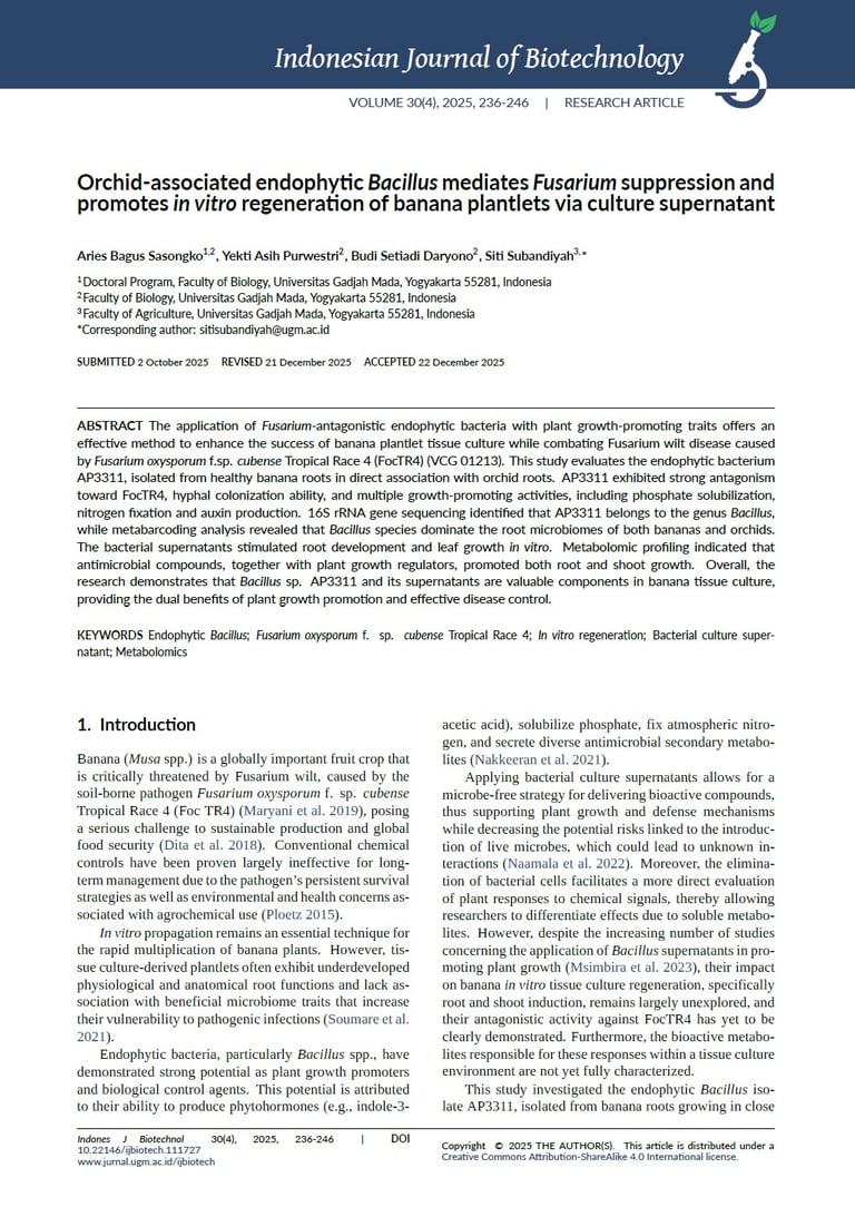 Orchid‐associated endophytic Bacillus mediates Fusarium suppression and promotes in vitro regeneration of banana plantlets via culture supernatant