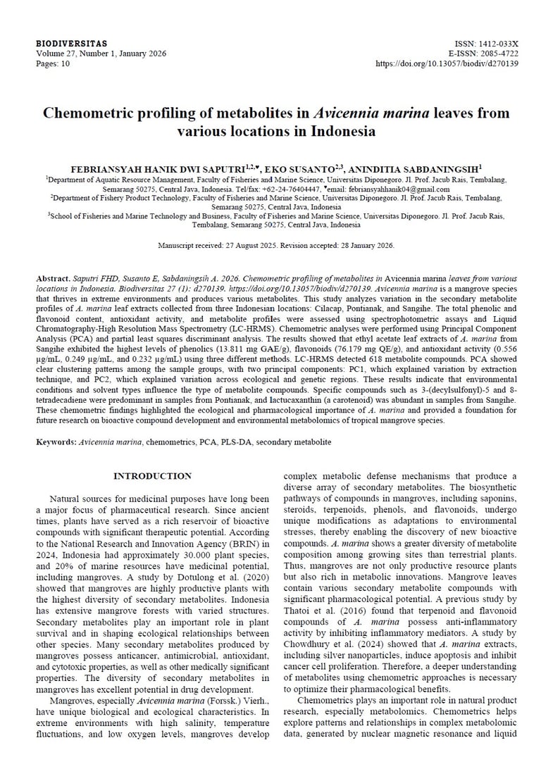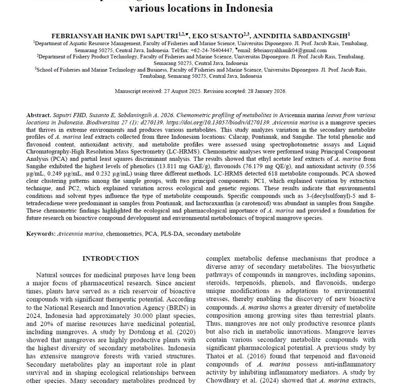 Chemometric profiling of metabolites in Avicennia marina leaves from various locations in Indonesia
