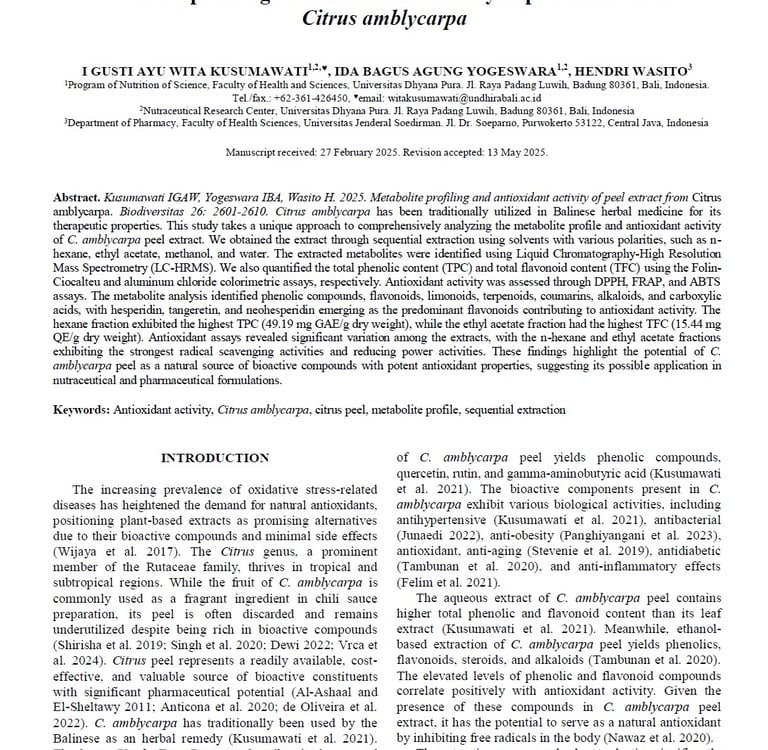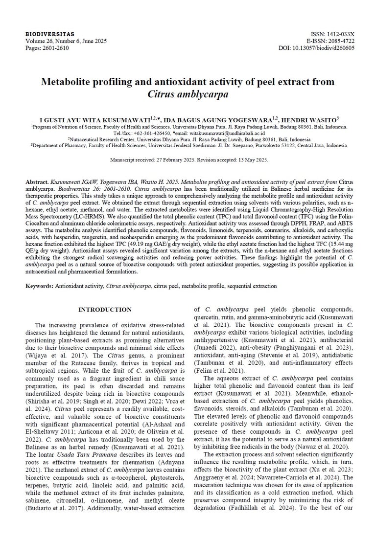 Metabolite profiling and antioxidant activity of peel extract from Citrus amblycarpa. https://doi.org/10.13057/biodiv/d260605