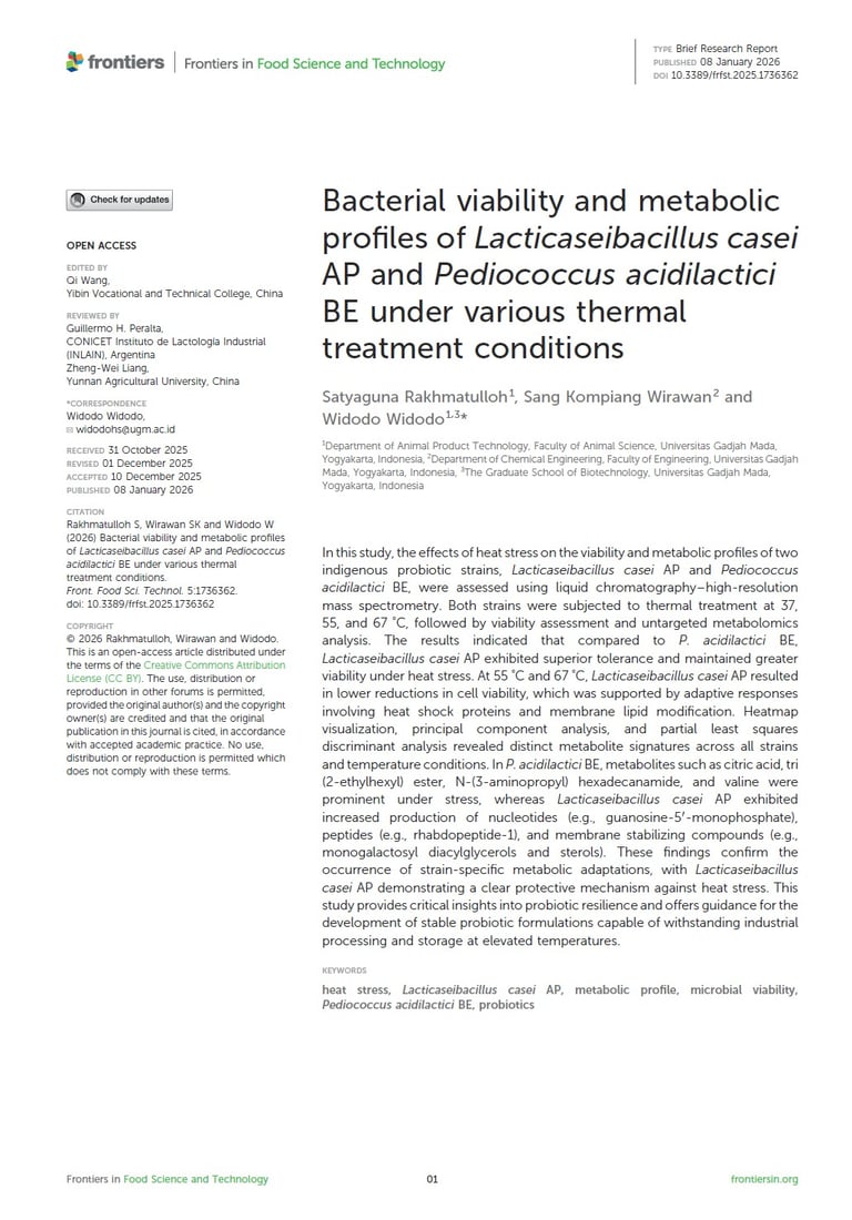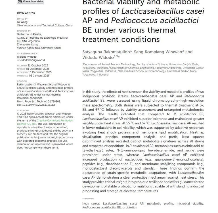 Bacterial viability and metabolic profiles of Lacticaseibacillus casei AP and Pediococcus acidilactici BE under various thermal treatment conditions. Front. Food Sci. Technol., 08 January 2026. https://doi.org/10.3389/frfst.2025.1736362