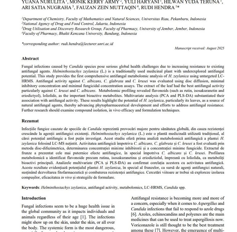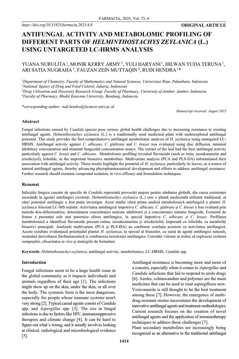 ANTIFUNGAL ACTIVITY AND METABOLOMIC PROFILING OF DIFFERENT PARTS OF HELMINTHOSTACHYS ZEYLANICA (L.) USING UNTARGETED LC-HRMS ANALYSIS. FARMACIA, 2025, Vol. 73, 6. https://doi.org/10.31925/farmacia.2025.6.8