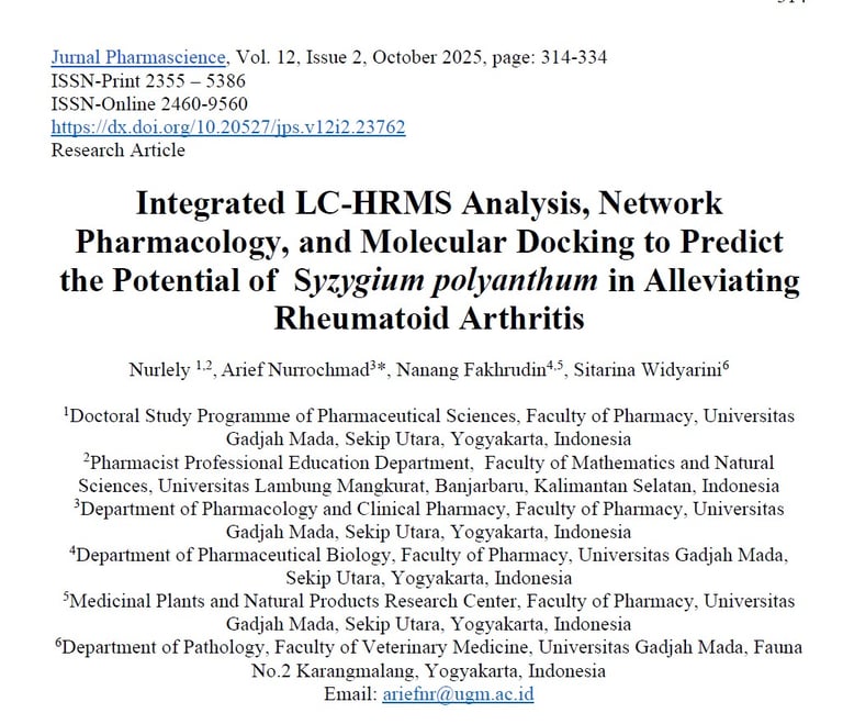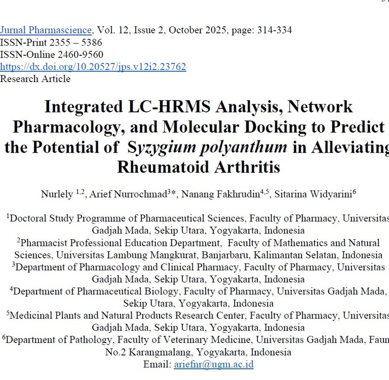 Integrated LC-HRMS Analysis, Network Pharmacology, and Molecular Docking to Predict the Potential of Syzygium polyanthum in Alleviating Rheumatoid Arthritis. Jurnal Pharmascience, Vol. 12, Issue 2, October 2025, page: 314-334