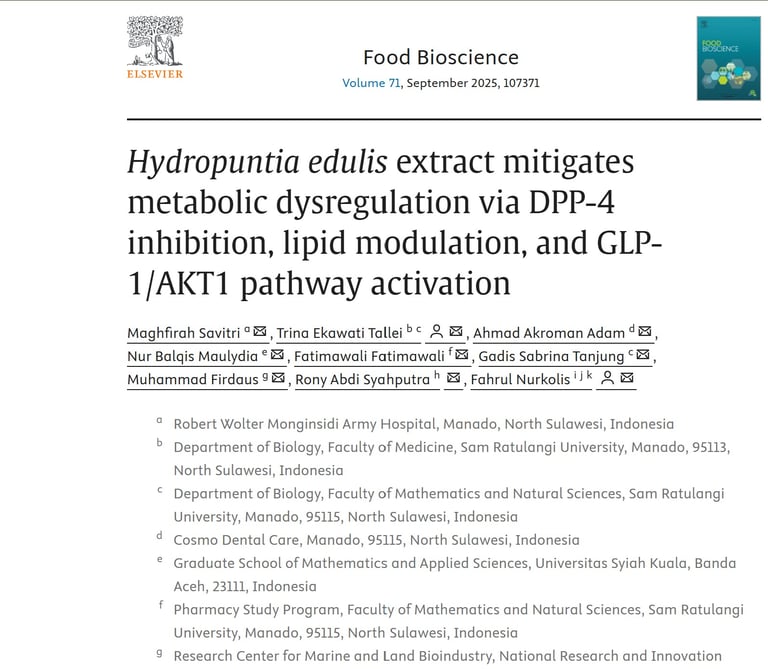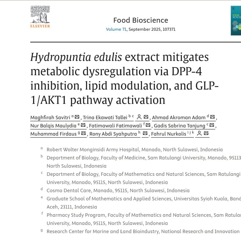 Hydropuntia edulis extract mitigates metabolic dysregulation via DPP-4 inhibition, lipid modulation, and GLP-1/AKT1 pathway activation. Elsevier. Food Bioscience. Volume 71, September 2025, 107371