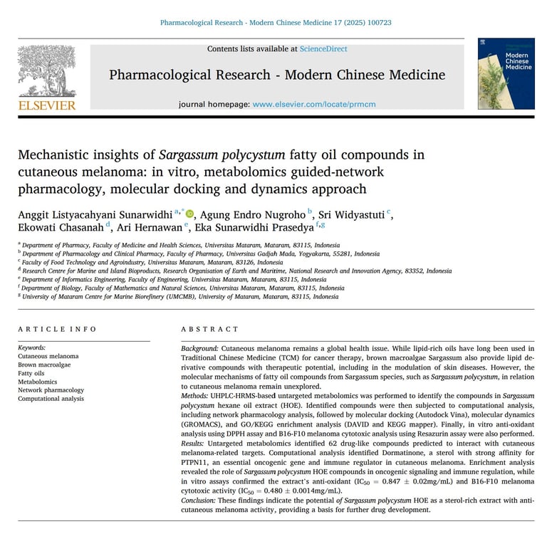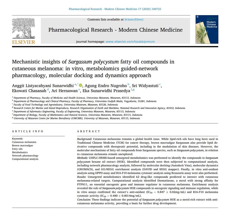 Mechanistic insights of Sargassum polycystum fatty oil compounds in cutaneous melanoma: in vitro, metabolomics guided-network pharmacology, molecular docking and dynamics approach. Elsevier. Pharmacological Research - Modern Chinese Medicine (17), 2025