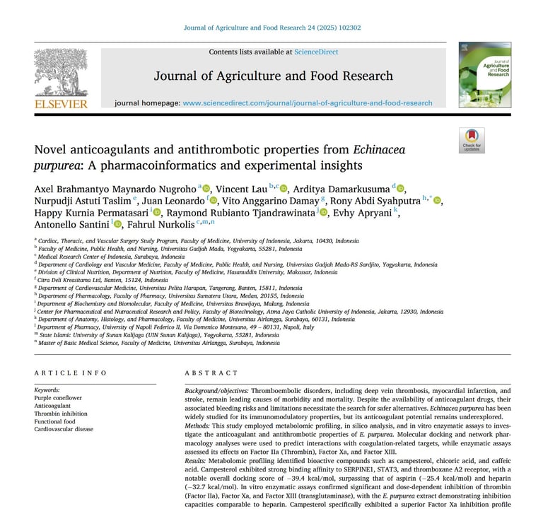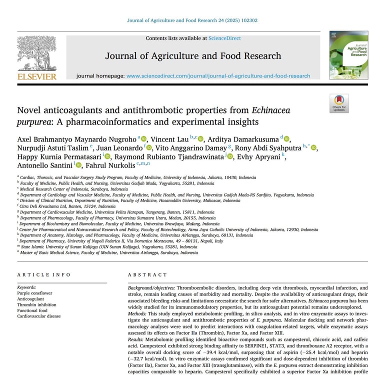 Novel anticoagulants and antithrombotic properties from Echinacea purpurea: A pharmacoinformatics and experimental insights. Elsevier. Journal of Agriculture and Food Research. Volume 24, December 2025, 102302.