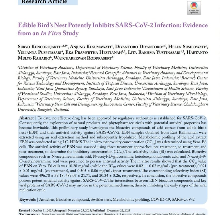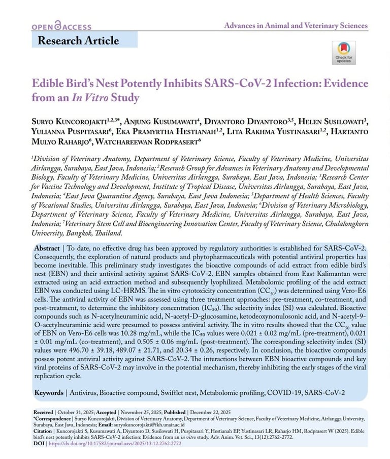 Edible Bird’s Nest Potently Inhibits SARS-CoV-2 Infection: Evidence from an In Vitro Study. Adv. Anim. Vet. Sci., Vol. 13, Iss. 12, pp. 2762-2772