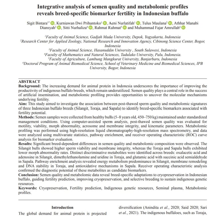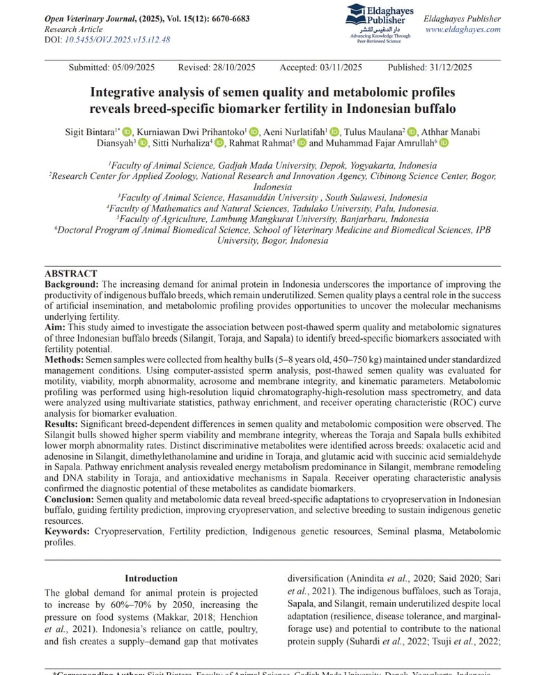 Integrative analysis of semen quality and metabolomic profiles reveals breed-specific biomarker fertility in Indonesian buffalo. Open Veterinary Journal, (2025), Vol. 15(12): 6670-6683.