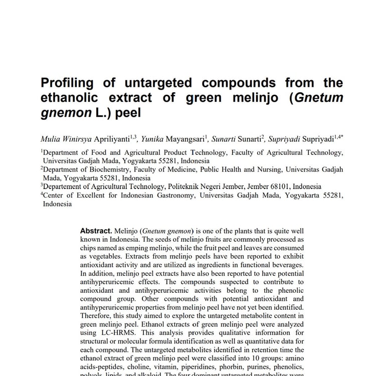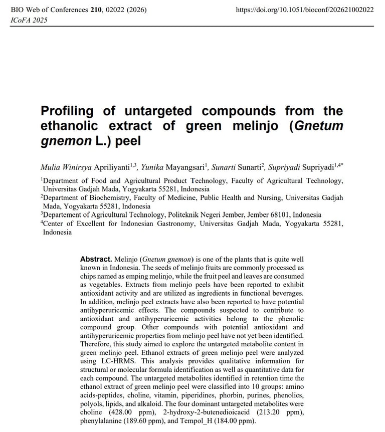 Profiling of untargeted compounds from the ethanolic extract of green melinjo (Gnetum gnemon L.) peel. BIO Web of Conferences 210, 02022 (2026)