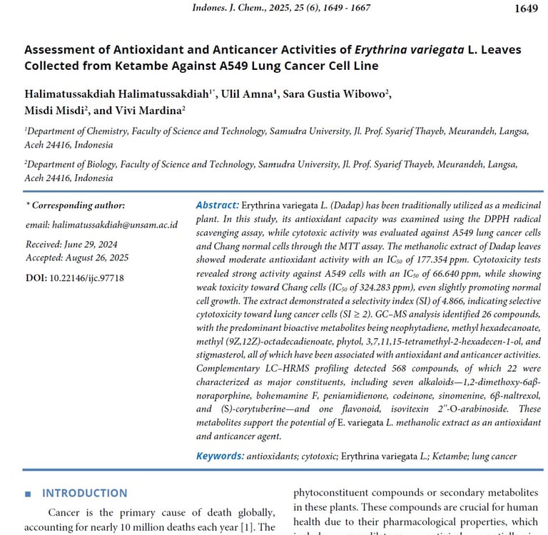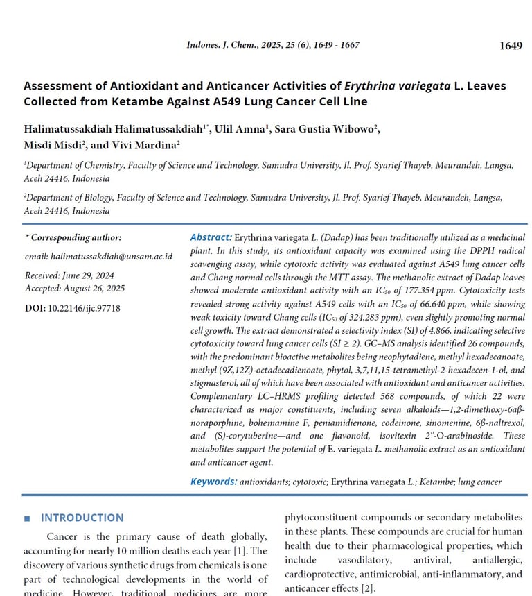 Assessment of Antioxidant and Anticancer Activities of Erythrina variegata L. Leaves Collected from Ketambe Against A549 Lung Cancer Cell Line. Indones. J. Chem., 2025, 25 (6), 1649 - 1667