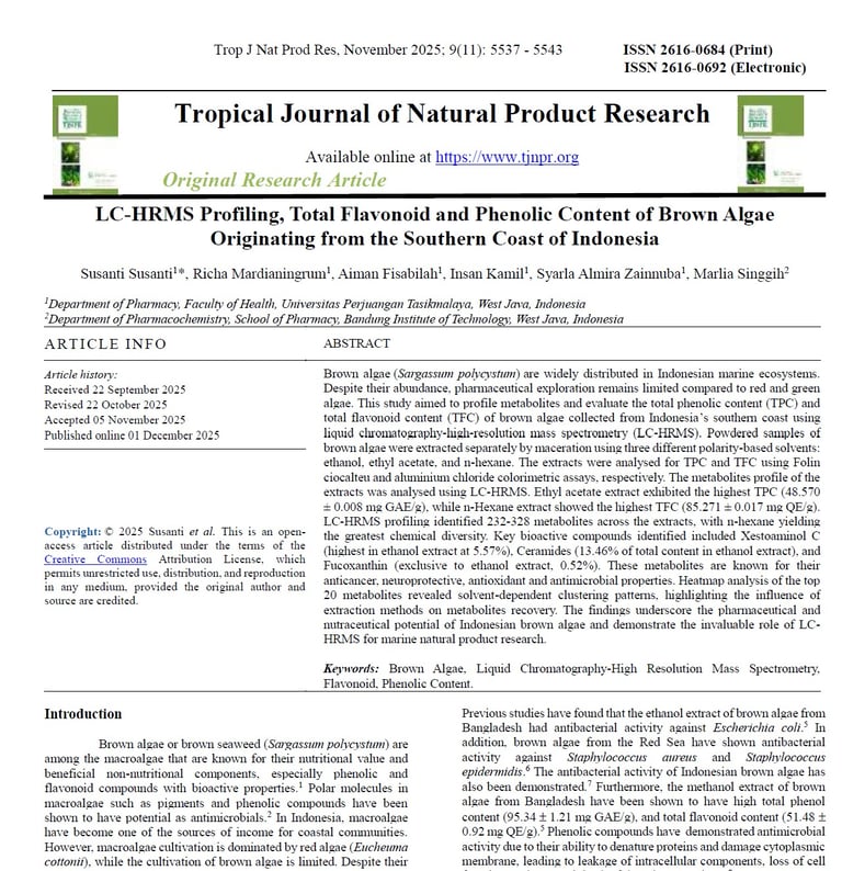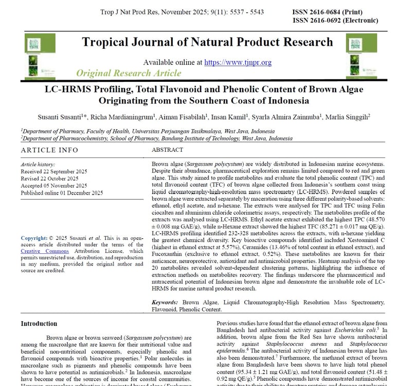 LC-HRMS Profiling, Total Flavonoid and Phenolic Content of Brown Algae Originating from the Southern Coast of Indonesia. Trop J Nat Prod Res, November 2025; 9(11): 5537 - 5543
