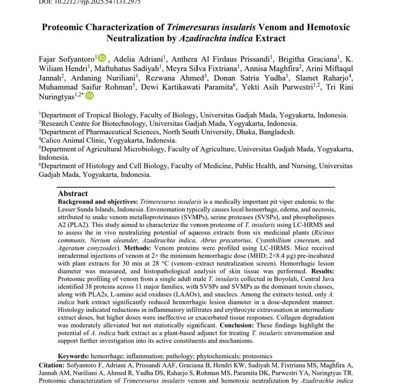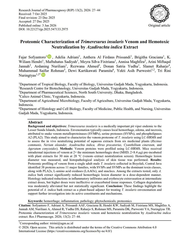 Proteomic Characterization of Trimeresurus insularis Venom and Hemotoxic Neutralization by Azadirachta indica Extract. Res J Pharmacogn. 2026; 13(2): 27–44.