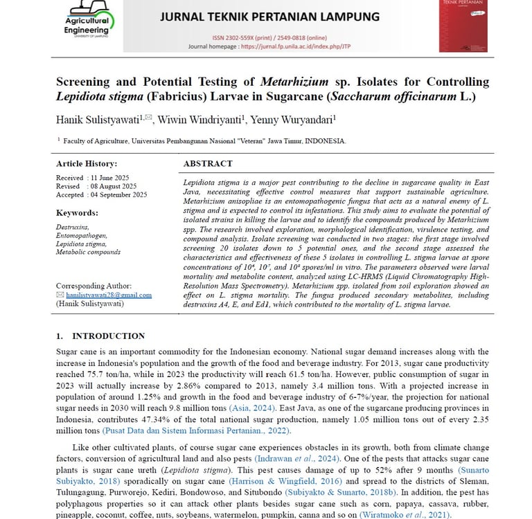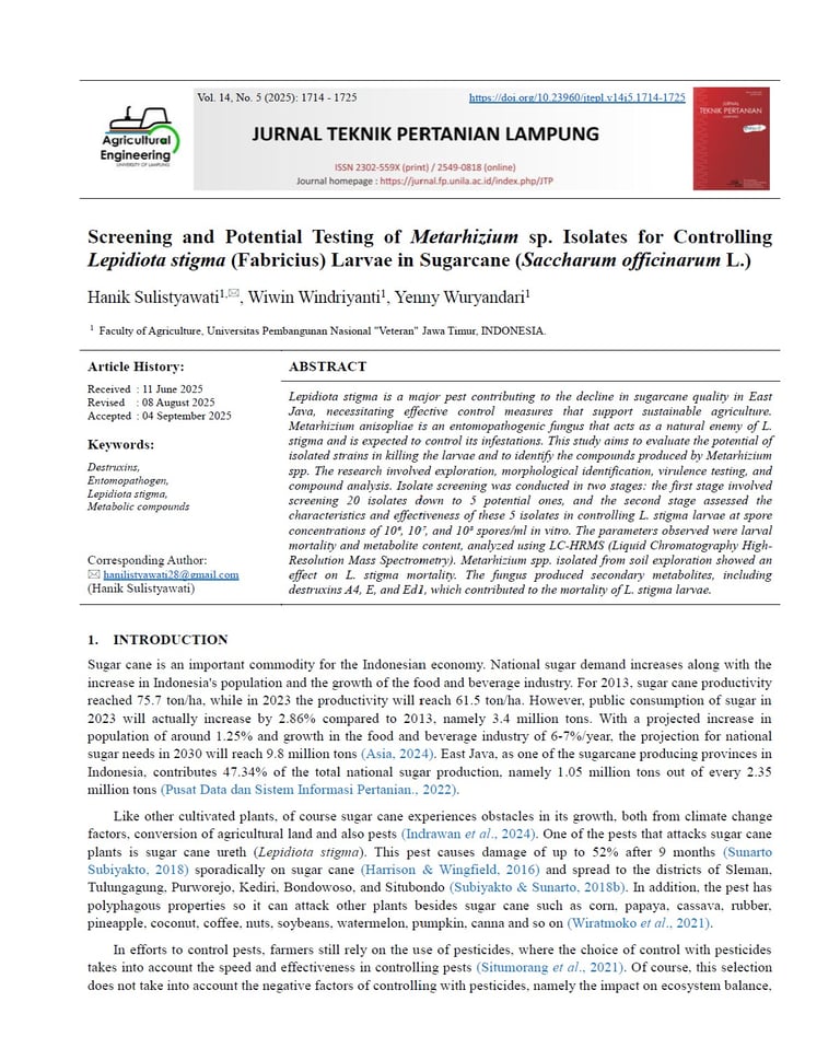 Screening and Potential Testing of Metarhizium sp. Isolates for Controlling Lepidiota stigma (Fabricius) Larvae in Sugarcane (Saccharum officinarum L.).