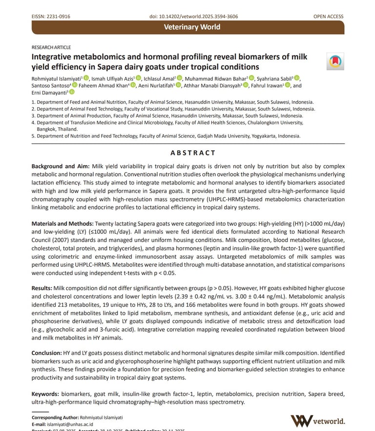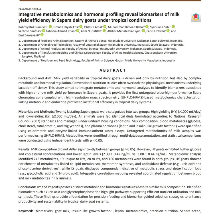 Integrative metabolomics and hormonal profiling reveal biomarkers of milk yield efficiency in Sapera dairy goats under tropical conditions. Veterinary World. doi: 10.14202/vetworld.2025.3594-3606
