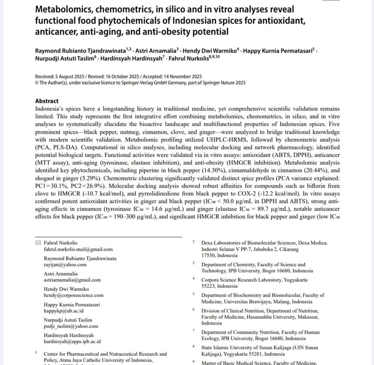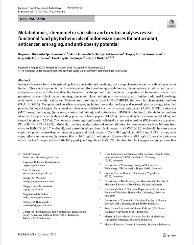 Tjandrawinata, R.R., Arnamalia, A., Warmiko, H.D. et al. Metabolomics, chemometrics, in silico and in vitro analyses reveal functional food phytochemicals of Indonesian spices for antioxidant, anticancer, anti-aging, and anti-obesity potential. Eur Food Res Technol 252, 30 (2026). https://doi.org/10.1007/s00217-025-04928-2